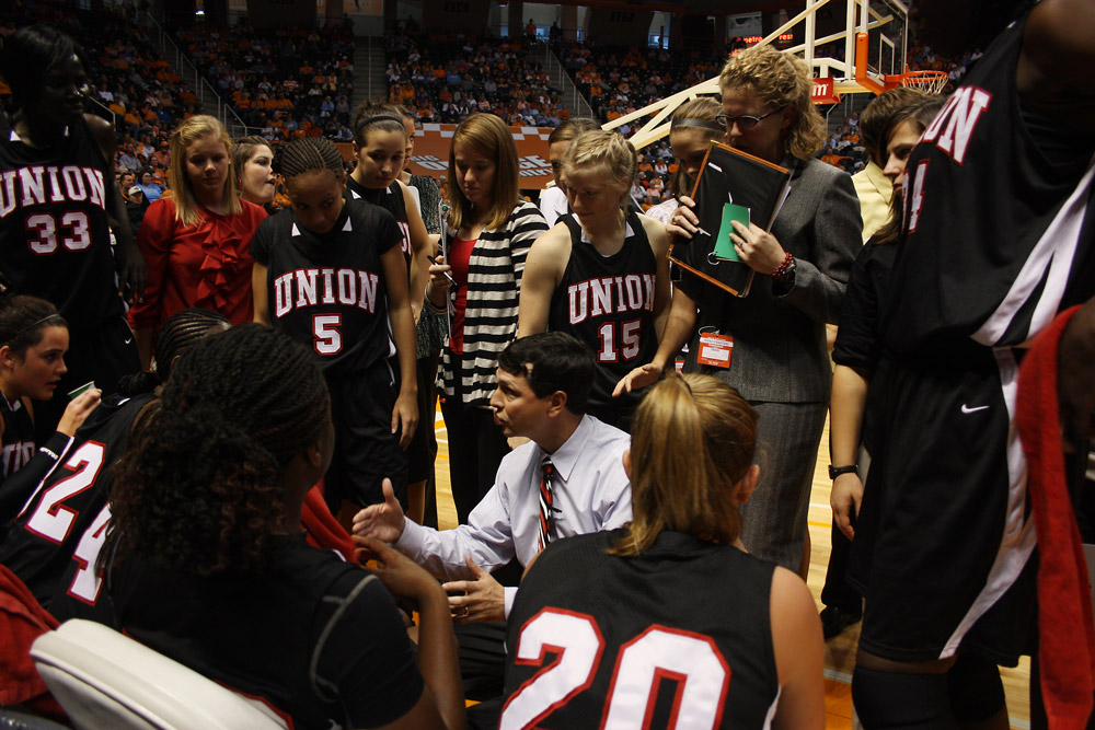 Mark Campbell, Union’s head coach, talks to his team during a timeout to go over a different strategy. Union’s Lady Bulldogs play in an expedition game against University of Tennessee at Knoxville on Dec. 7. | Photo by Ebbie Davis
