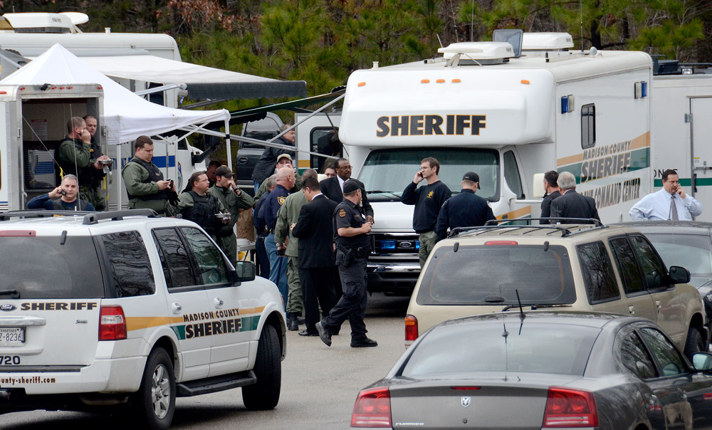 Fugitives1 Officers collaborate at command central in the Pringles Park parking lot before the announced apprehension of the two convicts, March 14. | Photo by Beth Spain